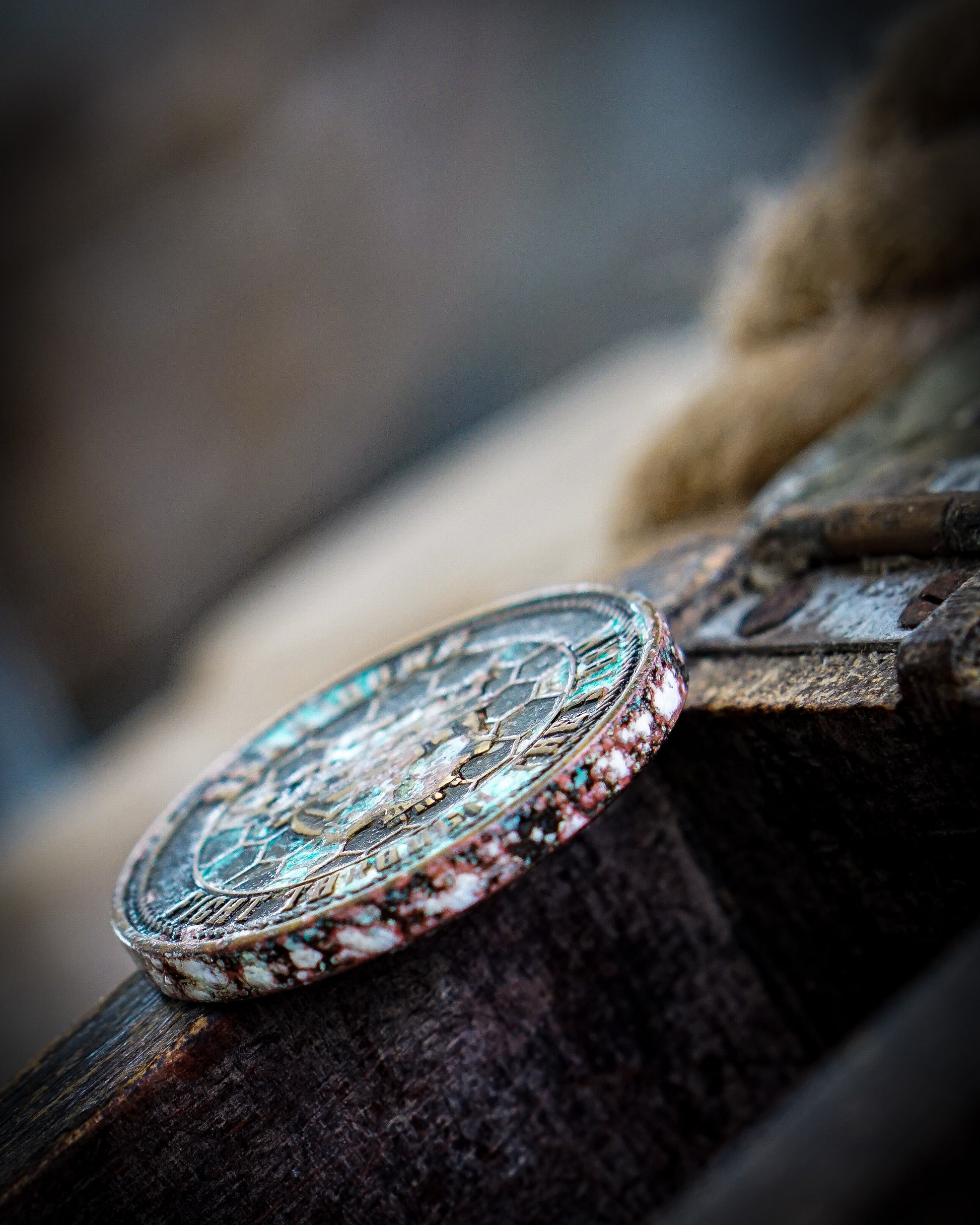 Each coin is forged from a single piece of solid brass, Then, a force patina has been applied over several weeks. The patina has darkened the background and really brought out the unique colours of each coin. Then we've polished the high spots back out to make the artwork pop again and then finally a protective clear coat to seal the patina in.