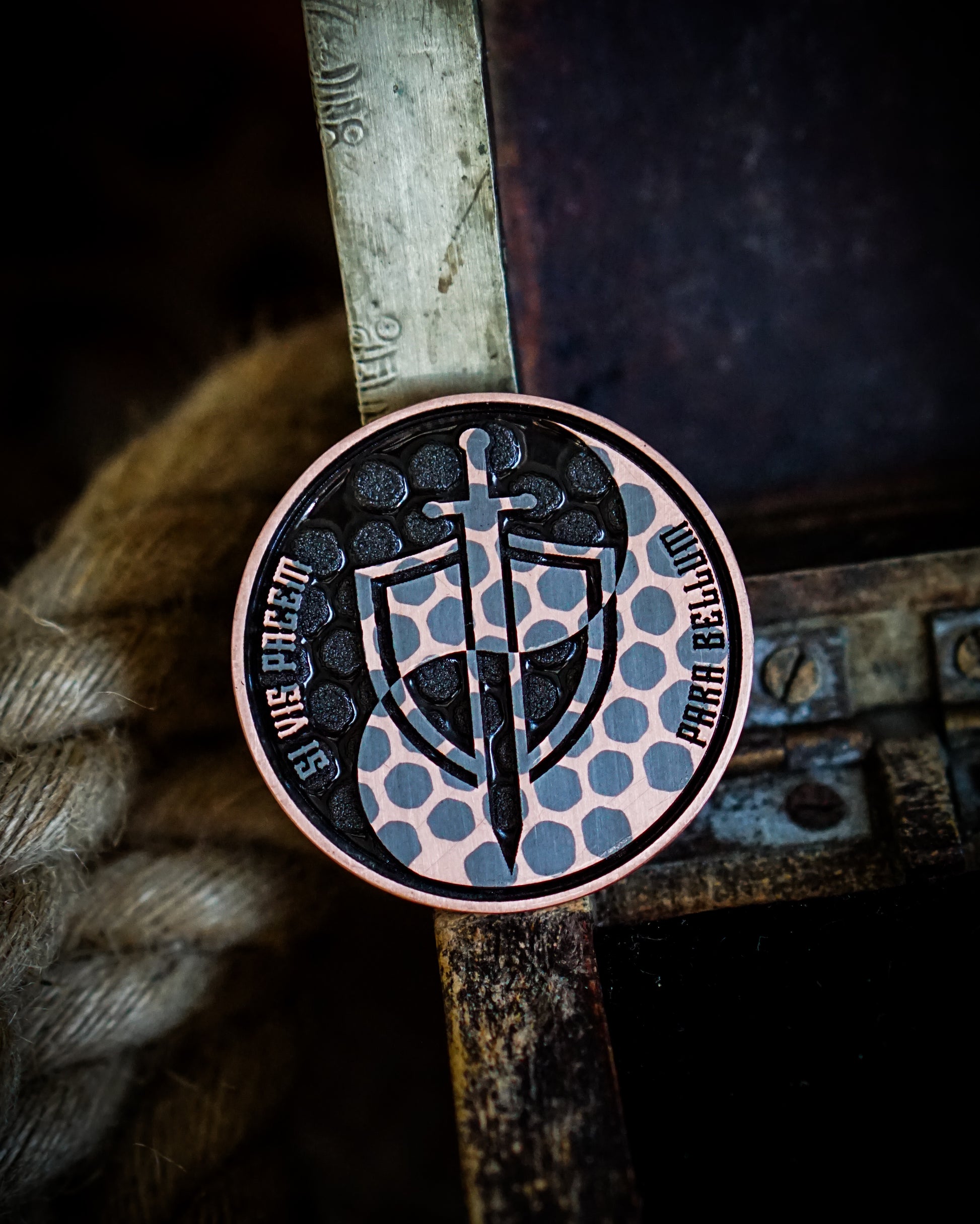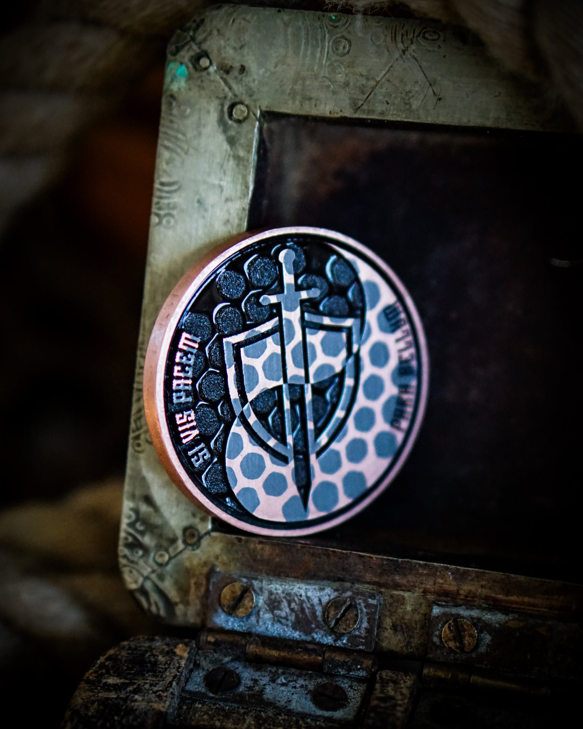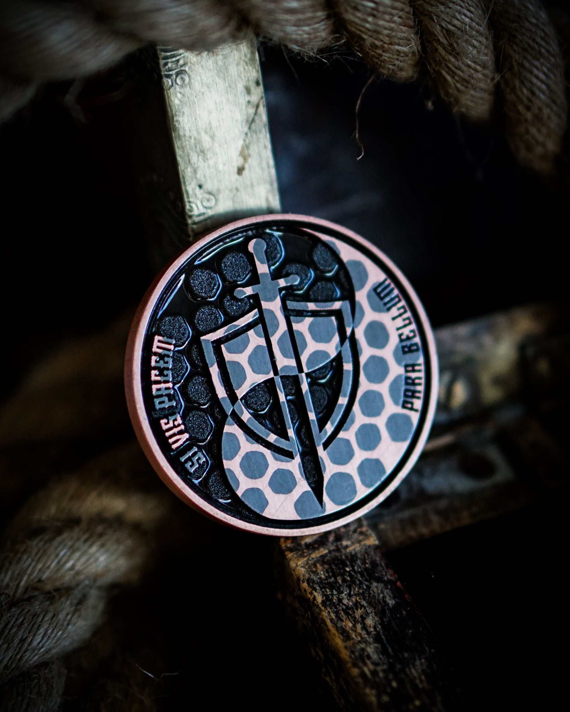 Forged from solid superconductor, this coin is a symbol of power, balance, and unwavering readiness. The design features a deeply engraved sword and shield, set against a honeycomb backdrop and laid out in a subtle yin-yang formation — a reminder that strength and restraint are two sides of the same force.