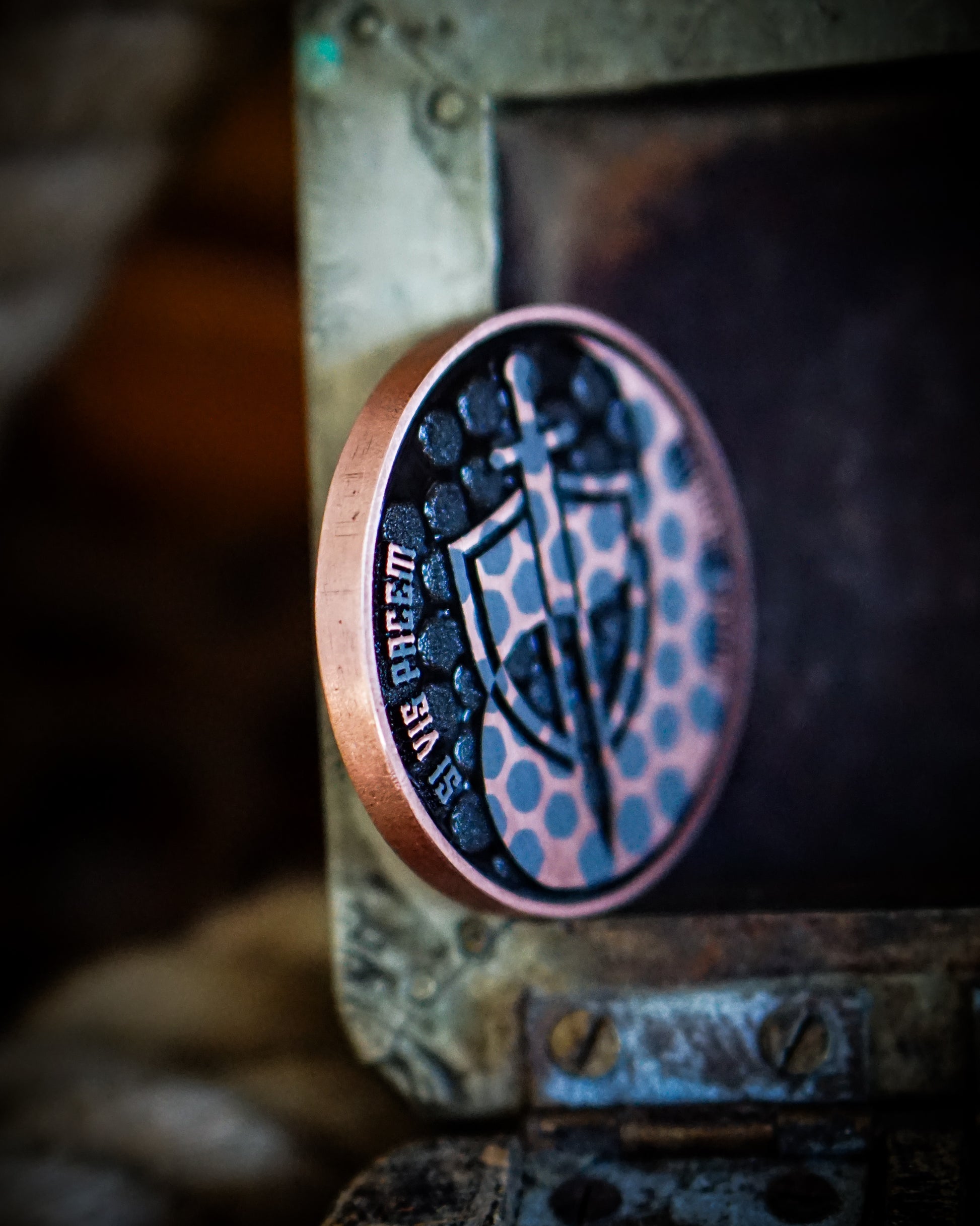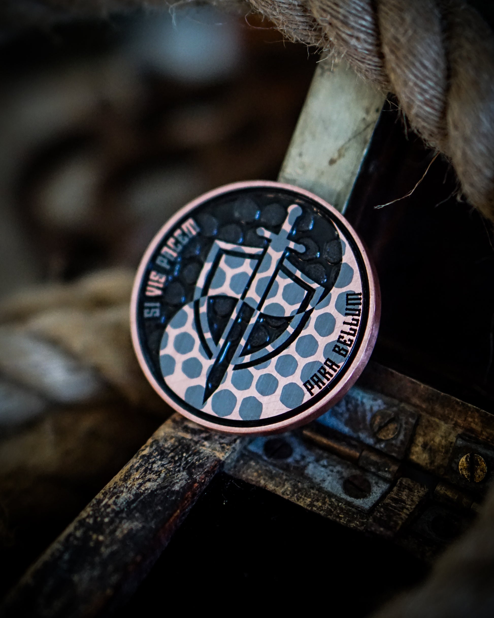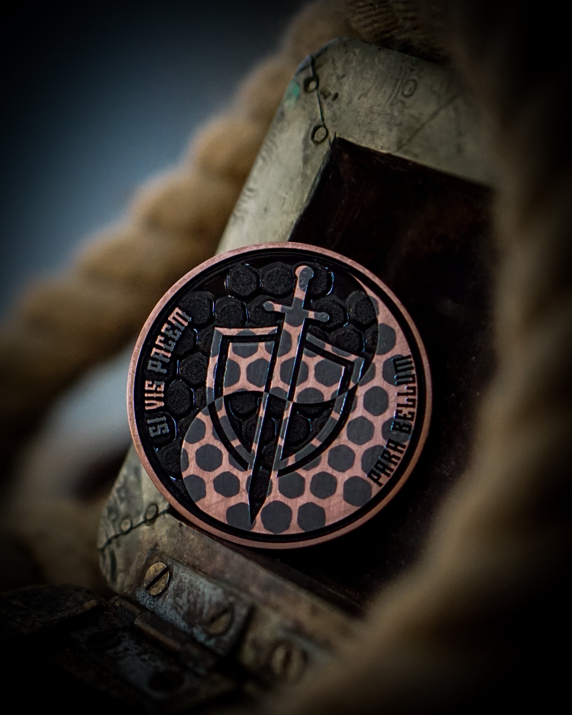 Forged from solid superconductor, this coin is a symbol of power, balance, and unwavering readiness. The design features a deeply engraved sword and shield, set against a honeycomb backdrop and laid out in a subtle yin-yang formation — a reminder that strength and restraint are two sides of the same force.