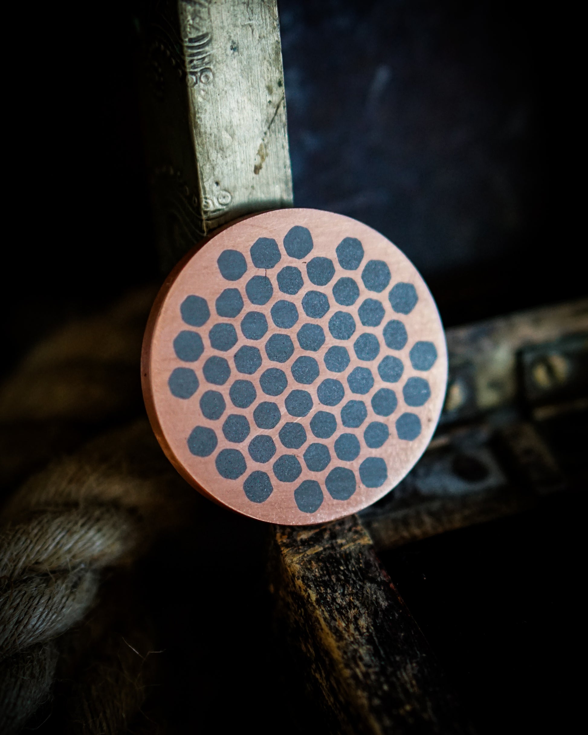 Each coin is engraved, acid etched, and sanded and finished in our workshop in QLD, Australia. The distinctive copper and niobium lattice of the superconductor gives every piece its own rugged fingerprint — no two are alike.