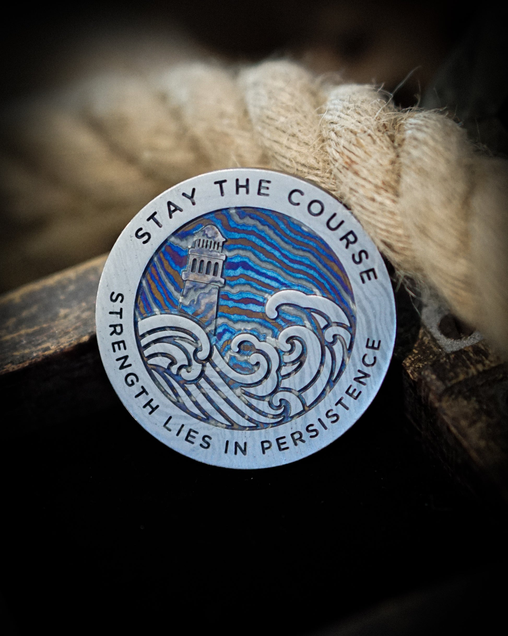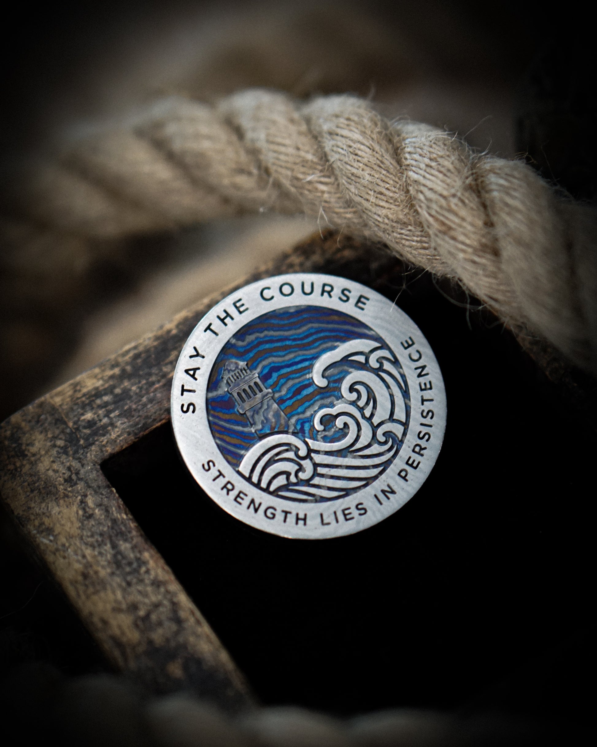 The other side displays a lighthouse standing defiant against crashing waves, paired with the powerful reminder: “Stay the course. Strength lies in persistence.”